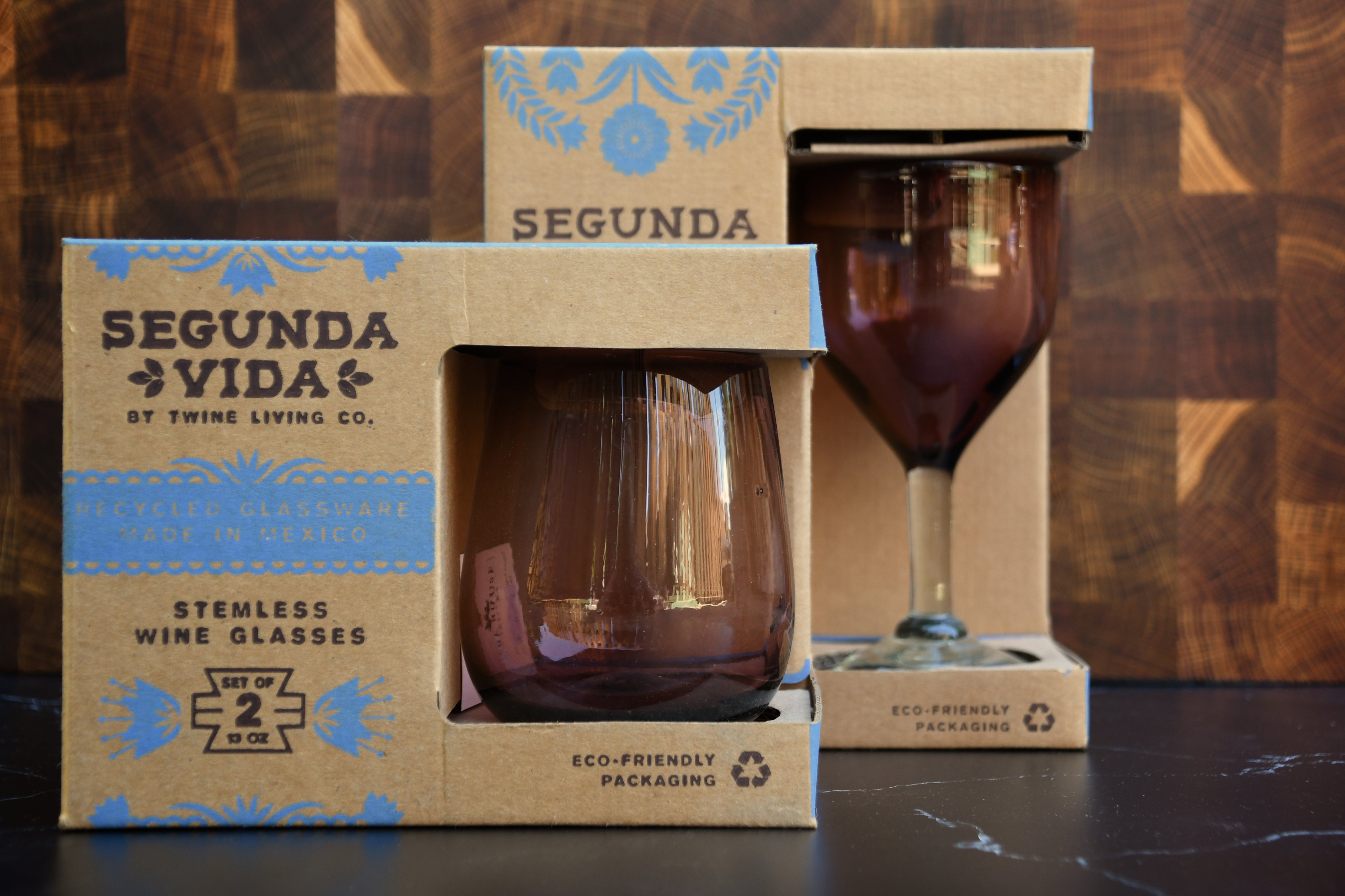 Not only are these set of 2 plum colored stemless wine glasses beautiful, they are also made from recycled glass making them eco-friendly! Enjoy the spill free design.